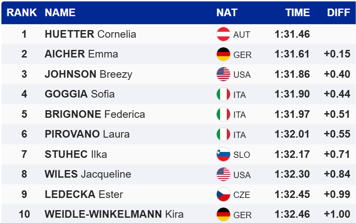 Хюттер на 0,15 секунды опередила талантливую немку Эмму Айхер, которая впервые в карьере поднялась на подиум на Кубке мира. Топ-3 замкнула свежеиспеченная чемпионка мира в скоростном спуске, американка Бризи Джонсон.
