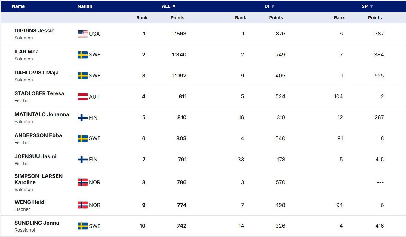 Третьей в спринте стала Надин Фендрих, которая в борьбе за подиум опередила Майю Дальквист. Рядом они финишировали и в масстарте, и там швейцарка снова обыграла Майю, заняв 9 место. В полуфинале спринта вылетела Ясми Йонсу – слабый результат, учитывая, что ей как спринтеру - темповику тяжелые по рельефу спринты подходят лучше. Тремя неделями ранее на похожей трассе в Валь ди Фьемме она одержала свою первую и пока единственную победу на Кубке мира.