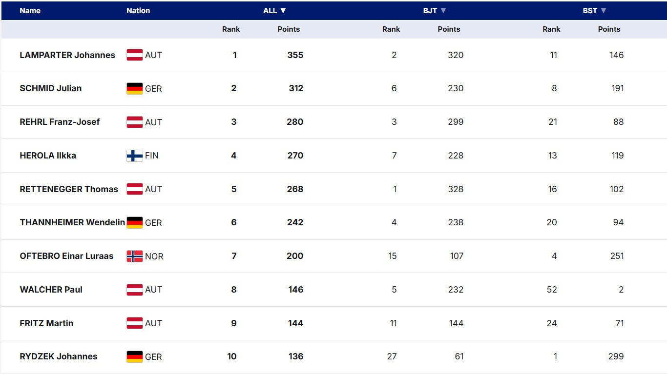 Пропасть в уровне между двумя лидерами сборной Германии и Гайгером и Веллингером сейчас просто огромна, и заполняет ее лишь Пьюс Пашке, который продолжает стабильно набирать очки – 17 и 12 места. Впрочем, все мы помним, что он является ярко выраженным "декабристом", поэтому в январе вполне может присоединиться к двум другим именитым ветеранам.