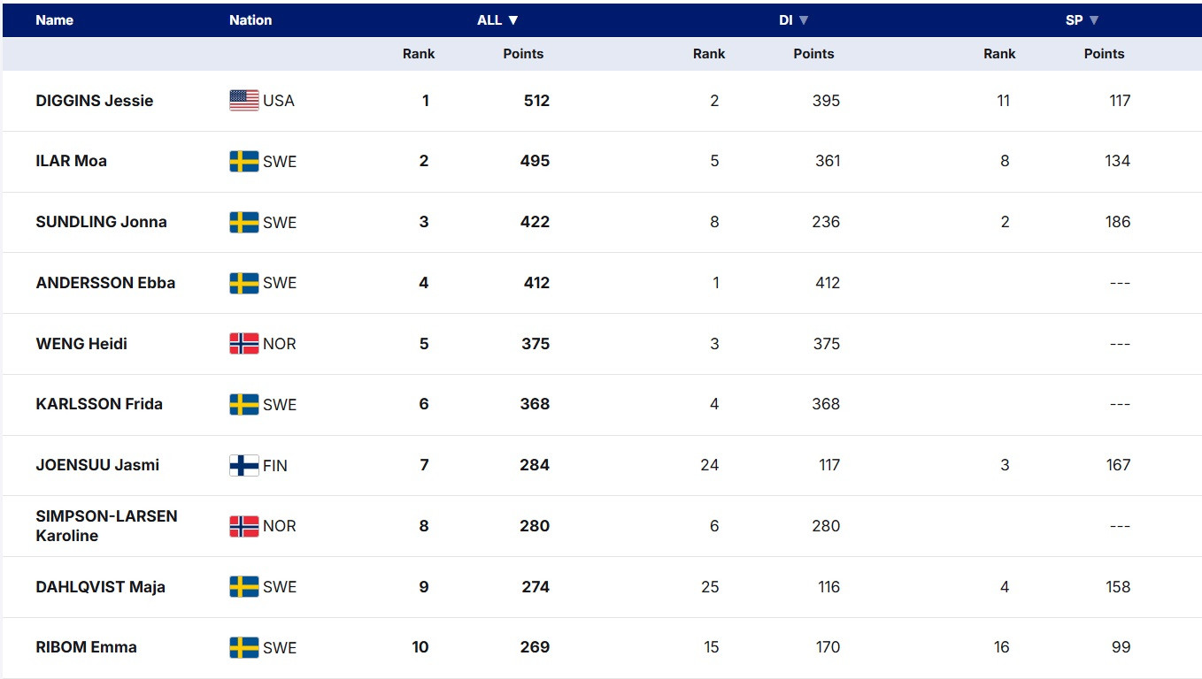 Что касается Илар, то она добралась до полуфинала спринта и стала четвертой в скиатлоне. На данный момент именно Моа выглядит главной (если не единственной) конкуренткой Диггинс в борьбе за Большой хрустальный глобус (БХГ). Шансов на личные медали на Олимпиаде-2026 у шведки немного, поэтому она абсолютно резонно делает ставку на Кубок мира, где сейчас проигрывает Диггинс лишь 17 очков.