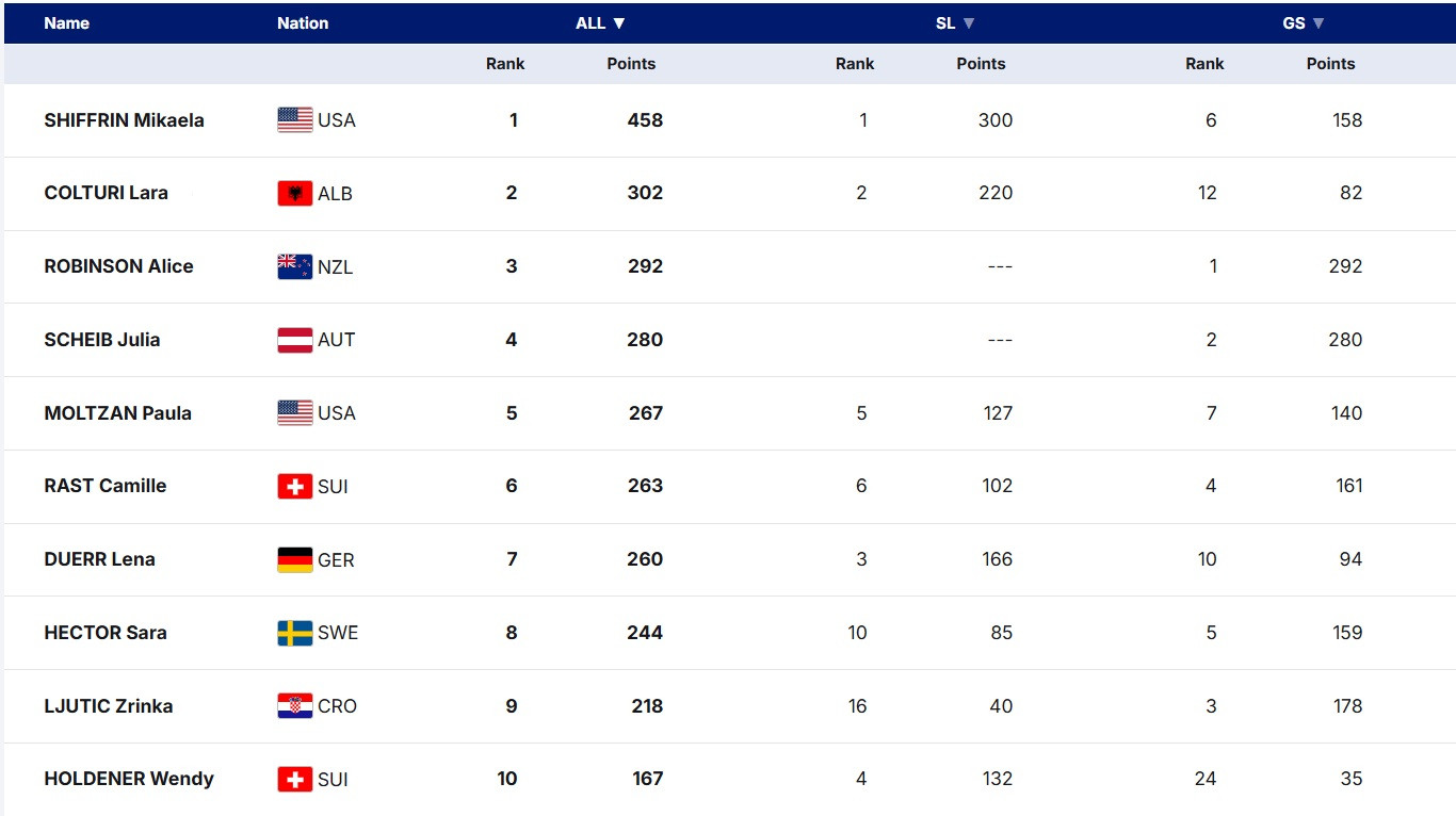 Хотя, откровенно говоря, образцом стабильности не была и она. В воскресенье Робинсон также лидировала после первой попытки и шла на победный дубль, однако в конце второго заезда допустила грубую ошибку, которая отбросила ее на третье итоговое место. Как бы там ни было, 160 очков за два старта позволили Элис возглавить зачет Кубка мира в гиганте.