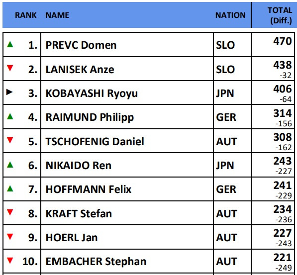 Как бы там ни было, во второй попытке Превц свою победу таки одержал, опередив Рёю Кобаяси на 0,9 балла. Справедливый и закономерный итог воскресного старта. Ну а Ланишек в Висле оказался в тени своего партнера по команде, заняв лишь 4 и 8 места. Впрочем, запас в общем зачете, который был у Анже до этапа в Висле, позволяет ему сейчас отставать от Домена всего на 32 балла.
