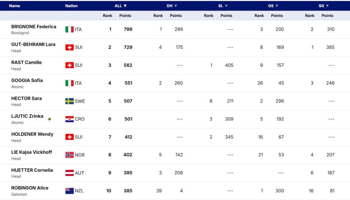 В субботнем скоростном спуске Лара стала лишь пятой, поэтому ее отставание от Бриньоне в общем зачете даже несколько увеличилось – до 70 очков. Все очевиднее становится то, что именно эти две спортсменки и разыграют Большой хрустальный глобус (БХГ).