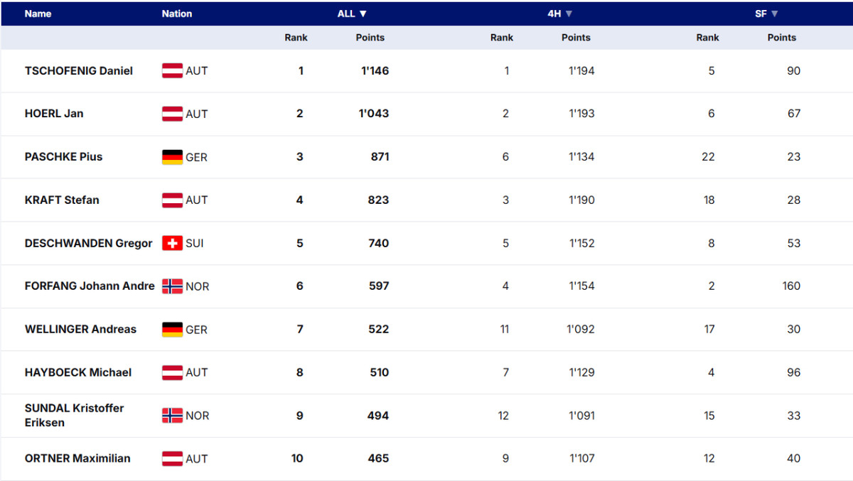 Ближайший преследователь Чофенига в общем зачете, Ян Херль, в Оберстдорфе также не впечатлил: 12 и 5 места. Причем, дважды австриец проваливал первую попытку и был вынужден делать рейды из глубины во втором раунде.
