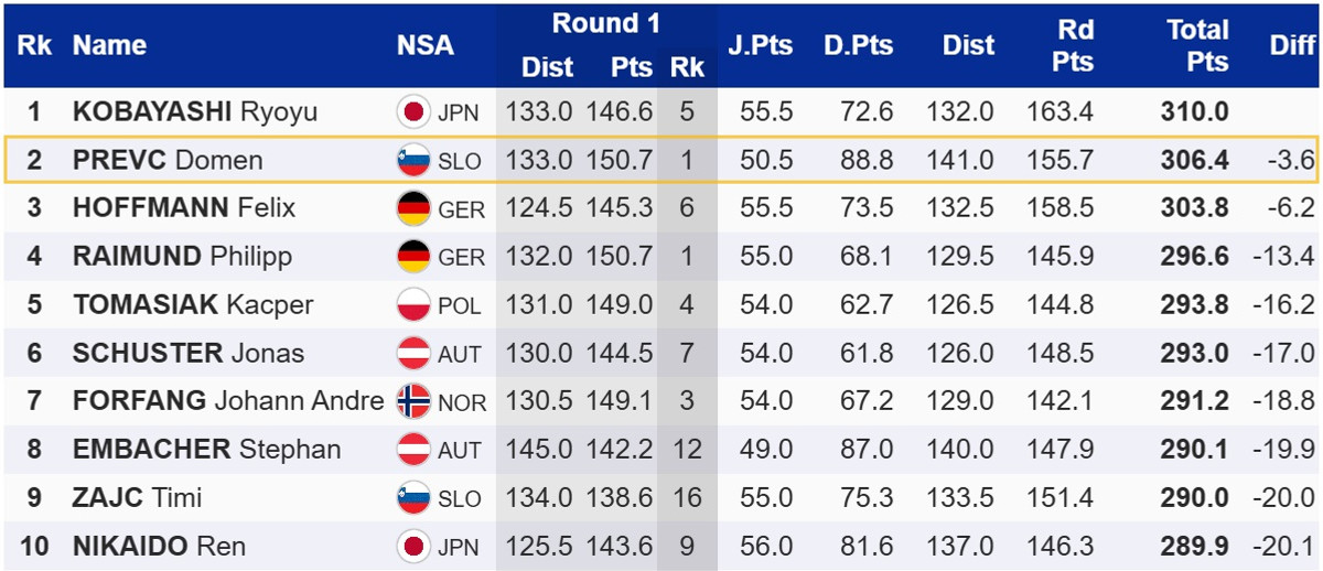 Вторым стал лидер общего зачета Кубка мира, словенец Домен Превц, чья победная серия прервалась на отметке в 5 стартов – он не сумел повторить рекорд по количеству побед на Кубке мира подряд. Топ-3 замкнул Феликс Хоффманн, который накануне выиграл квалификацию ко второму личному старту.
