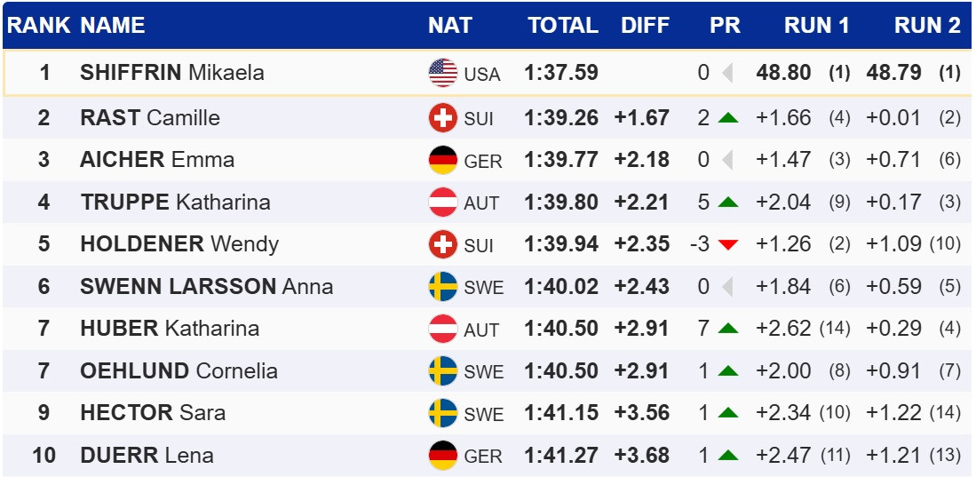 Сегодня в Шпиндлерув Млыне Шиффрин разгромила своих соперниц, опередив ближайшую преследовательницу, швейцарку Камиль Раст, на 1,67 секунд. Немка Эмма Айхер, занявшая третье место, проиграла Шиффрин более двух секунд.