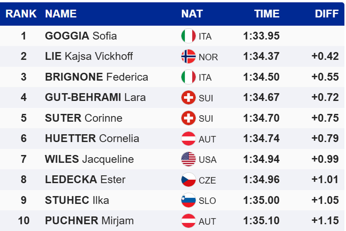 Годжа на 0,42 секунды опередила норвежку Кайсу Викхофф Ли. Топ-3 замкнула еще одна хозяйка соревнований, Федерика Бриньоне, которая вернула себе лидерство в общем зачете Кубка мира.