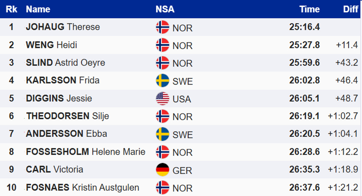 Йохауг обыграла двух партнерш по команде – Хейди Венг и Астрид Ойре Слинд. Четвертой финишировала шведка Фрида Карлссон. Эта победа позволила Терезе перехватить лидерство в общем зачете Кубка мира. Впрочем, потерять его она может уже завтра, 7 декабря, по итогам спринта свободным стилем, участвовать в котором норвежка не планирует.