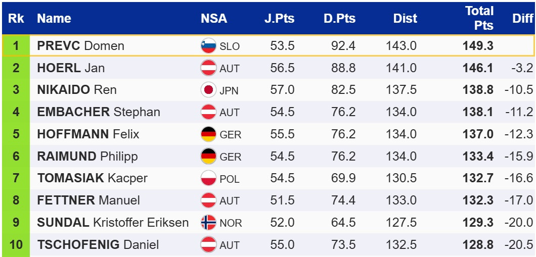 Выиграл первую попытку лидер Турне и Кубка мира, словенец Домен Превц. Он на 3,2 балла опережает австрийца Яна Хёрля. Топ-3 замыкает японец Рен Никайдо.