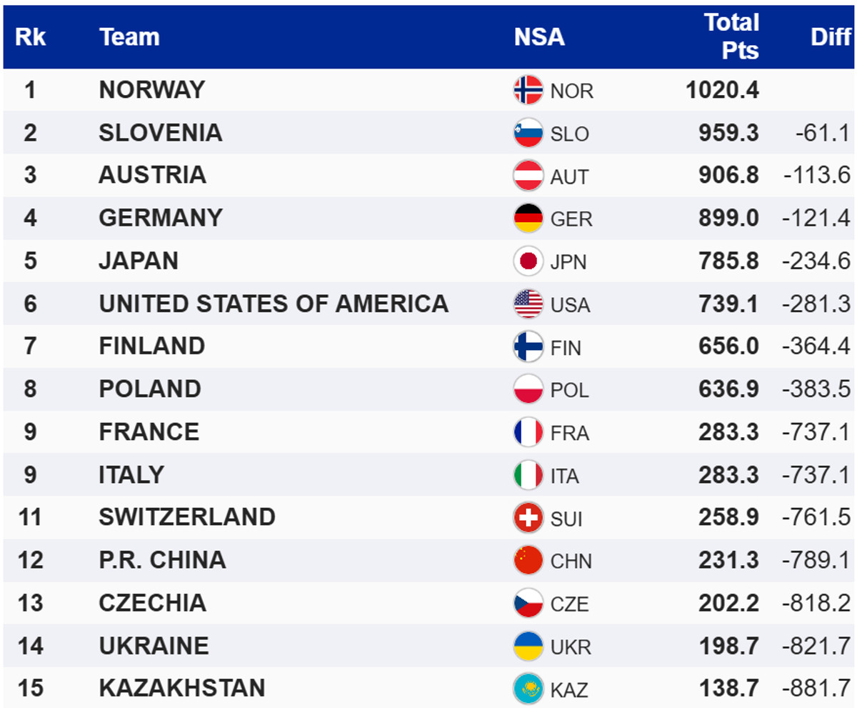 Они на 61,1 балла опередили сборную Словении в составе Эмы Клинец, Ники Превц, Домена Превца и Анже Ланишека. Бронзу завоевал австрийский квартет Эва Пинкельниг, Жаклин Зайфридсбергер, Штефан Крафт, Ян Хёрль.