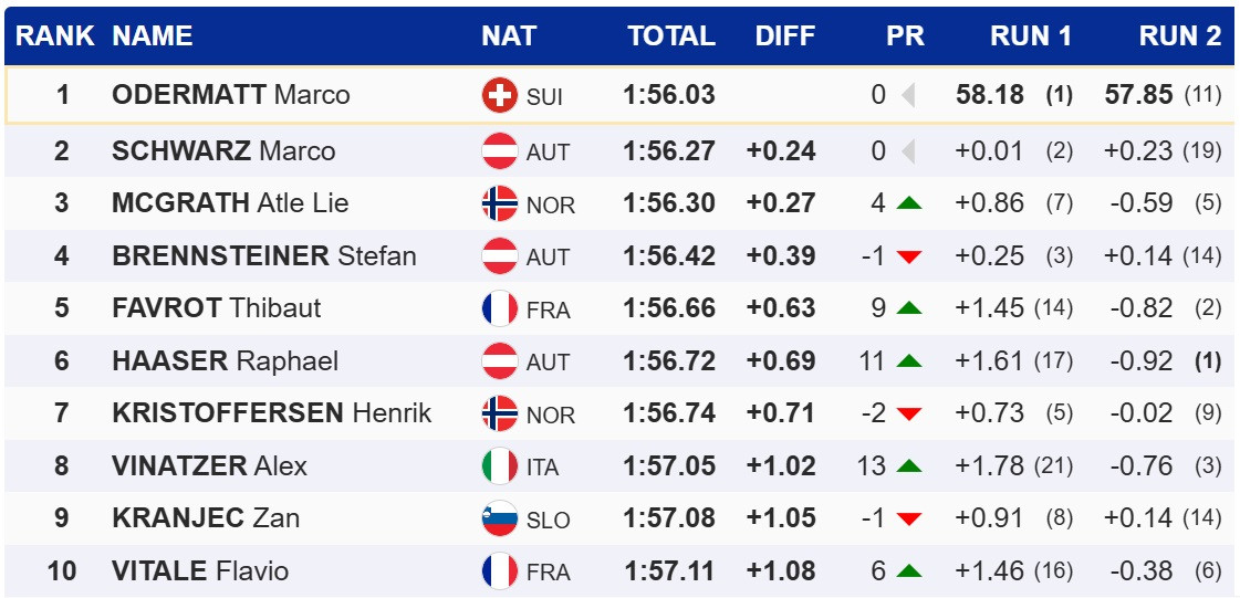 Швейцарский горнолыжник Марко Одерматт выиграл первый старт мужского Кубка мира сезона-2025/26 - гигантский слалом в австрийском Зольдене. Он на 0,24 секунды опередил хозяина соревнований, Марко Шварца, для которого это первый подиум на Кубке мира с декабря 2023 года.