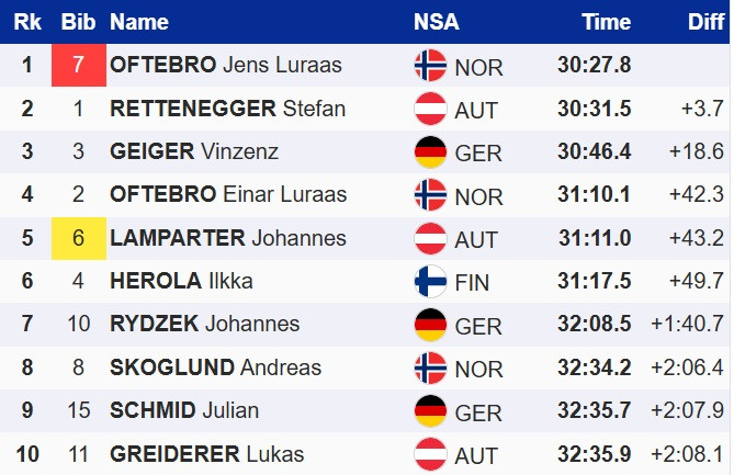 Офтебро в заключительной гонке совершил рейд с седьмого места и в итоге опередил на 3,7 секунды хозяина соревнований, австрийца Штефана Реттенеггера, который не удержал лидерство после прыжков. Топ-3 замкнул немец Винценц Гайгер, который накануне выиграл второй этап многодневки в Зеефельде.