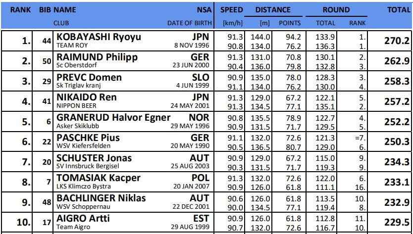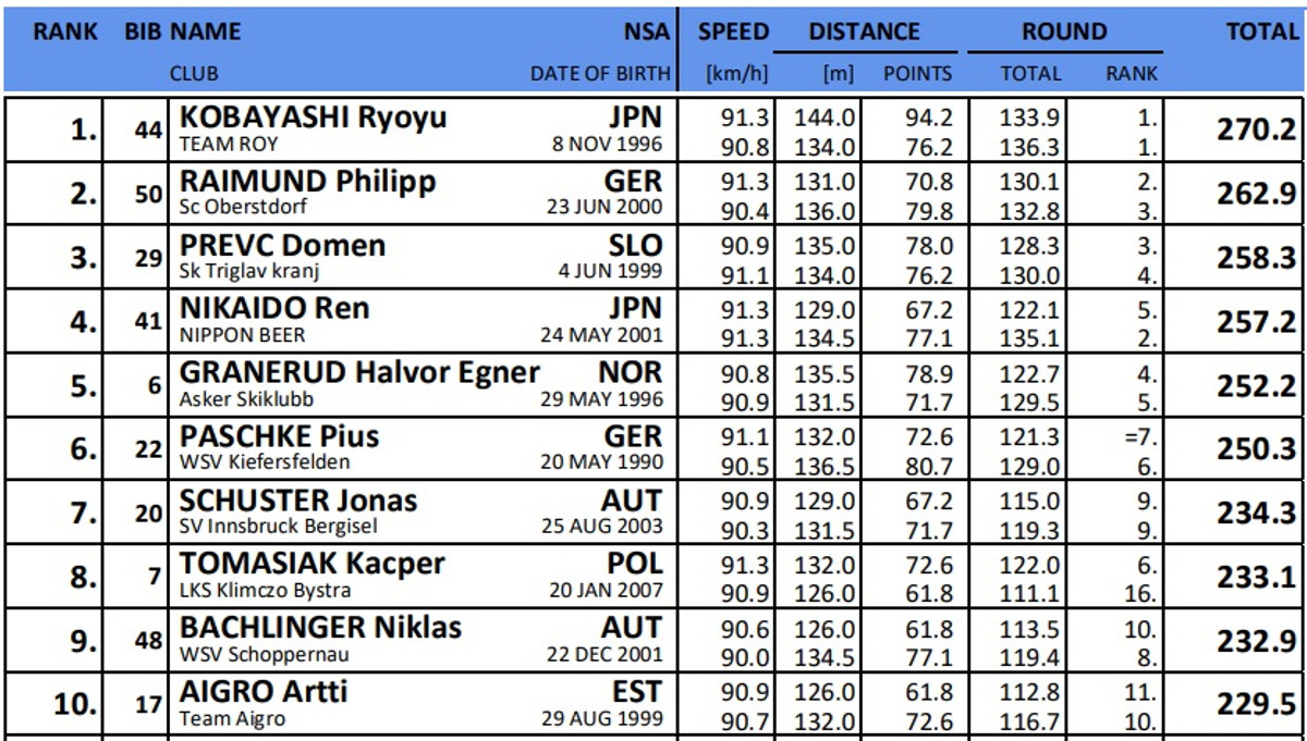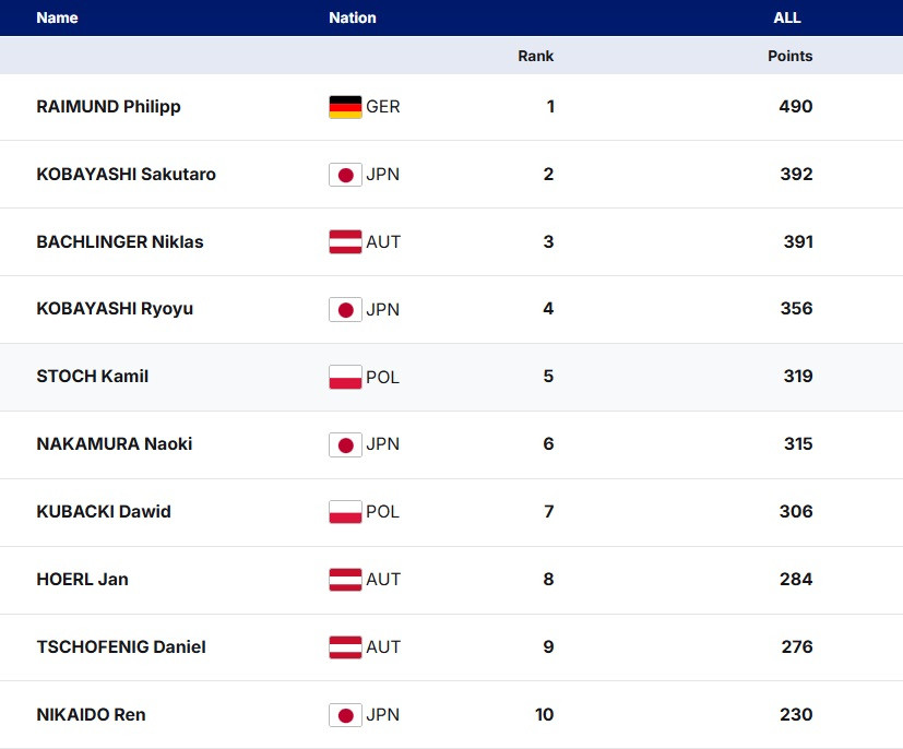 В общем зачете Раймунд набрал 490 очков, на 98 баллов опередив другого представителя Японии, Сакутаро Кобаяси. Топ-3 генеральной классификации замкнул австриец Никлас Бахлингер.