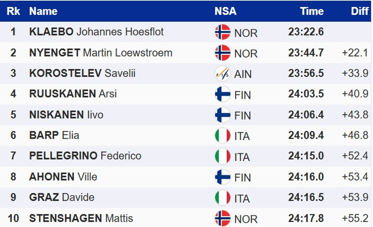 В разделке Клэбо на 22,1 секунды опередил партнера по команде Мартина Левстрёма Ньенгета. Топ-3 замкнул "нейтральный" россиянин Савелий Коростелев. Это первый подиум "нейтральных" российских лыжников на Кубке мира после их возвращения в международные соревнования.