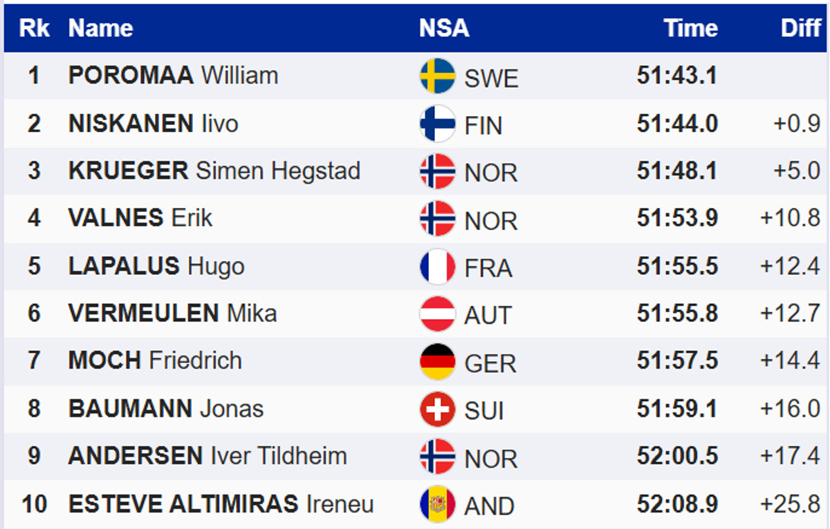 Поромя в финишном спринте опередил трехкратного олимпийского чемпиона финна Иво Нисканена. Компанию на подиуме им составил норвежец Симен Хегстад Крюгер, который проиграл победителю 5 секунд.