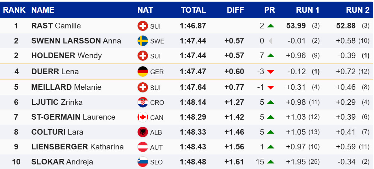 Раст на 0,57 секунды опередила шведку Анну Свенн Ларссон и партнершу по команде Венди Холденер, с идентичной суммой времени двух попыток разделивших второе место. Лидировавшая после первой попытки немка Лена Дюрр в итоге финишировала четвертой.