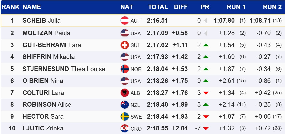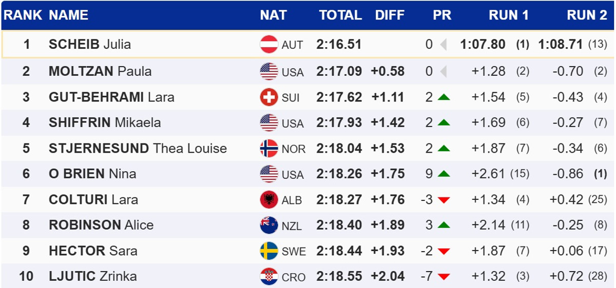 Шайб на 0,58 секунды опередила американку Полу Мольцан. Компанию на подиуме им составила швейцарка Лара Гут-Бехрами. Звездная Микаэла Шиффрин заняла четвертое место.
