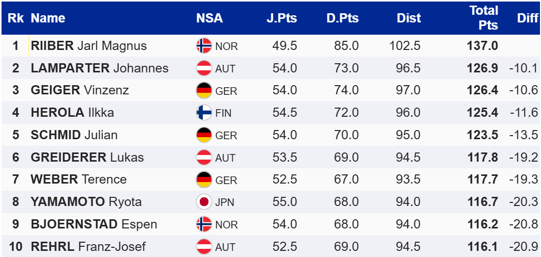 Благодаря гениальному прыжку на 102,5 метра он опередил австрийца Йоханнеса Лампартера. Топ-3 замкнул ближайший преследователь Риибера в общем зачете Кубка мира, немец Винценц Гайгер, который финишировал первым в гонке на 10 км.