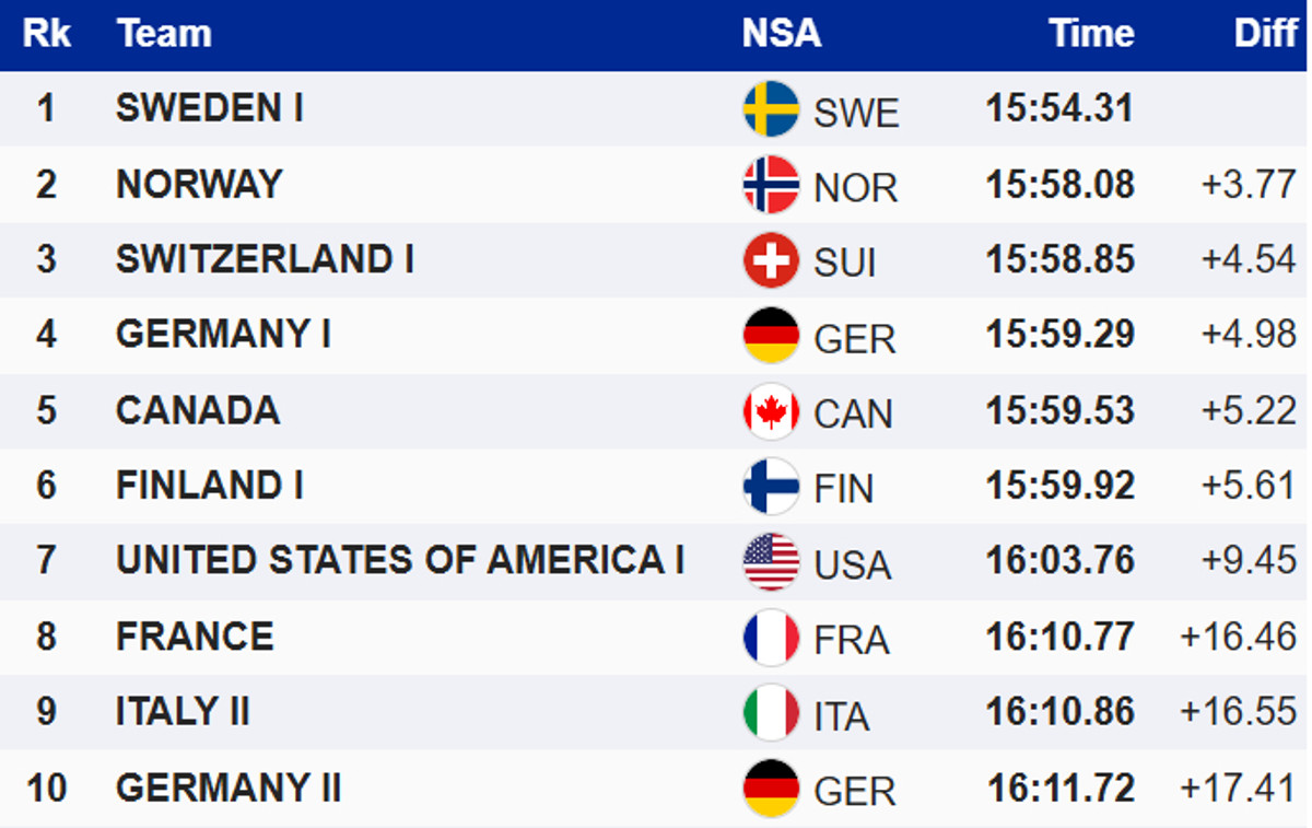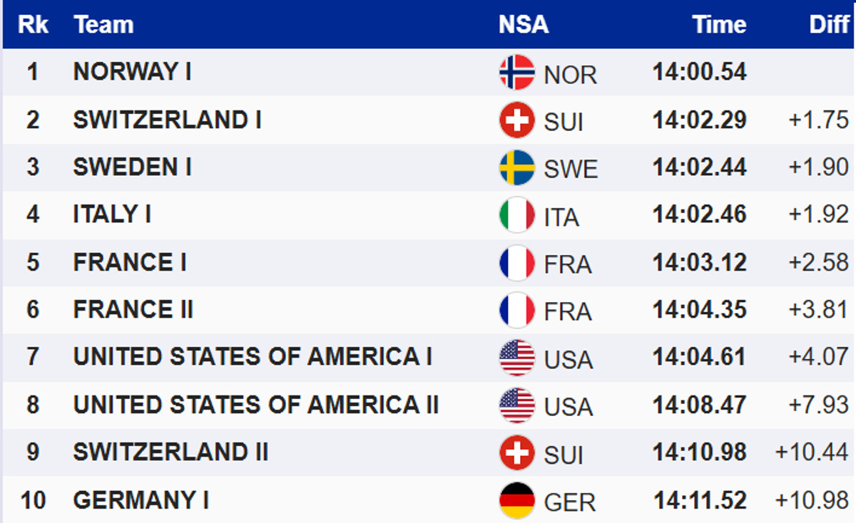 Победу одержал опередивший хозяев норвежский дуэт Пол Гульберг/Йоханнес Клебо, опередивший хозяев, команду Швейцарии (Яник Рибли/Валерио Гронд). В борьбе за бронзу шведы (Йохан Хагстрем/Эдвин Ангер) благодаря фотофинишу опередили Италию (Элия Барп/Федерико Пеллегрино).