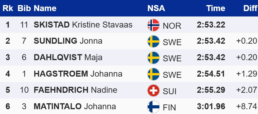 У женщин победу также праздновала сборная Норвегии – сильнейшей стала Кристин Шистад. Она в финале опередила двух представительниц Швеции – Йонну Сундлинг и Майю Дальквист.