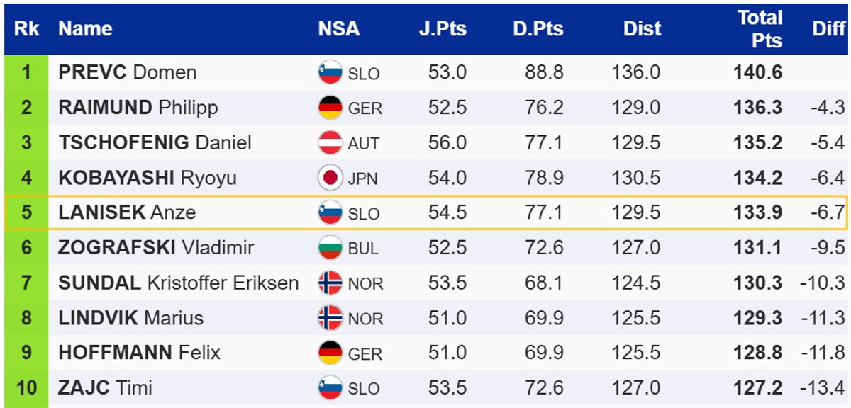 Лидирует после первой попытки словенец Домен Превц, который на 4,3 балла опережает немца Филиппа Раймунда. Топ-3 замыкает австриец Даниэль Чофениг. Лидер Кубка мира, словенец Анже Ланишек, замыкает топ-5.