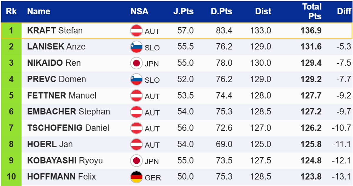 Выиграл первую попытку лидер общего зачета Кубка мира, австриец Штефан Крафт. Перед финальным раундом он на 5,3 балла опережает словенца Анже Ланишека. Топ-3 замыкает японец Рен Никайдо.