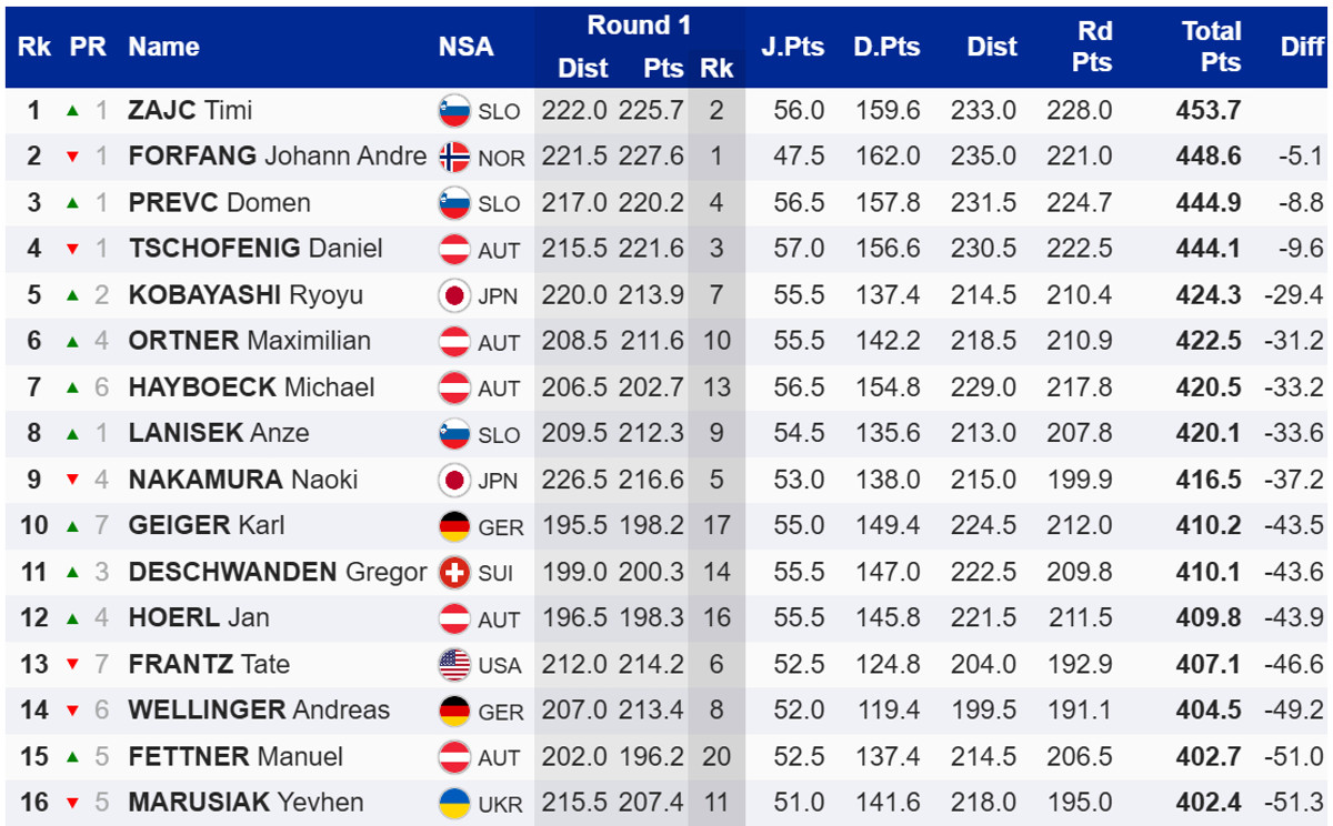 Победу одержал словенец Тими Зайц, который опередил норвежца норвежца Йоханна Андре Форфанга и своего партнера по команде, Домена Превца.