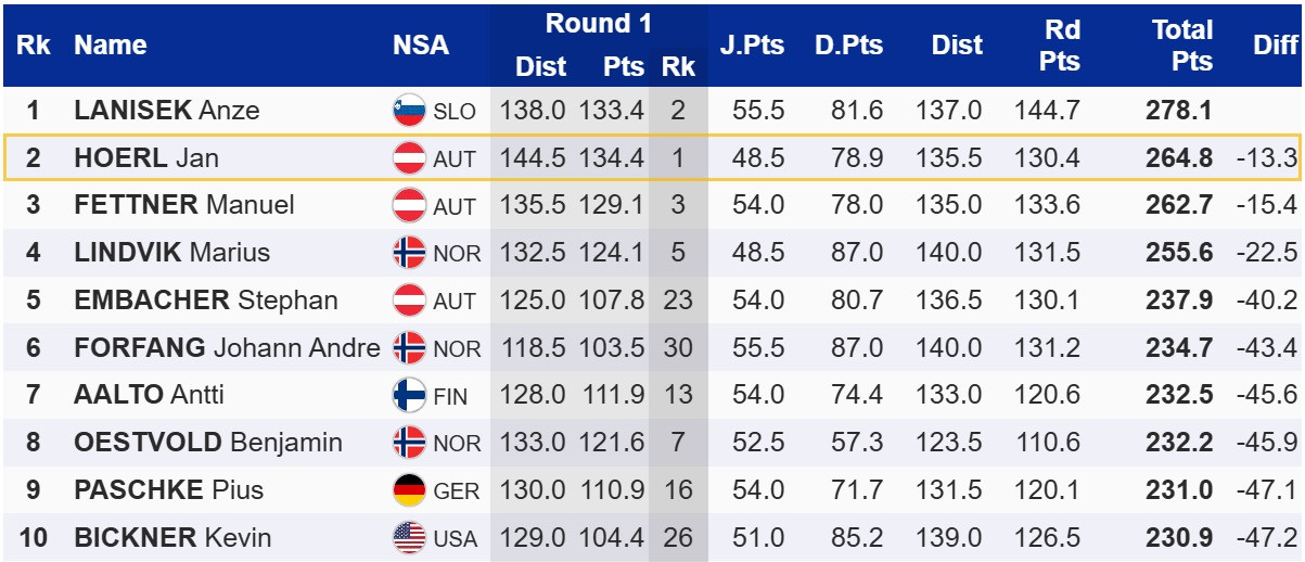 Победу одержал его партнер по сборной Словении, Анже Ланишек. Компанию на подиуме ему составили два австрийца – Ян Хёрль и Мануэль Феттнер.