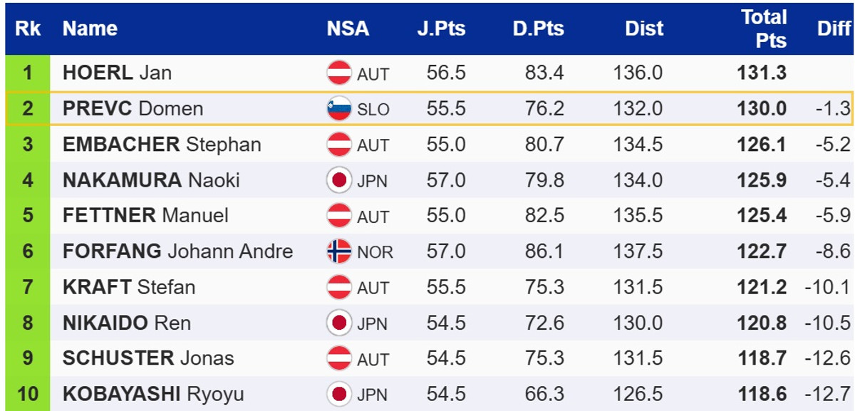 Выиграл первую попытке австриец Ян Хёрль, который всего на 1,3 балла опережает лидера общего зачета Кубка мира, Домена Превца. Топ-3 замыкает еще один австриец, Штефан Эмбахер. Лидер сборной Японии, Рёю Кобаяси, лишь замыкает топ-10.