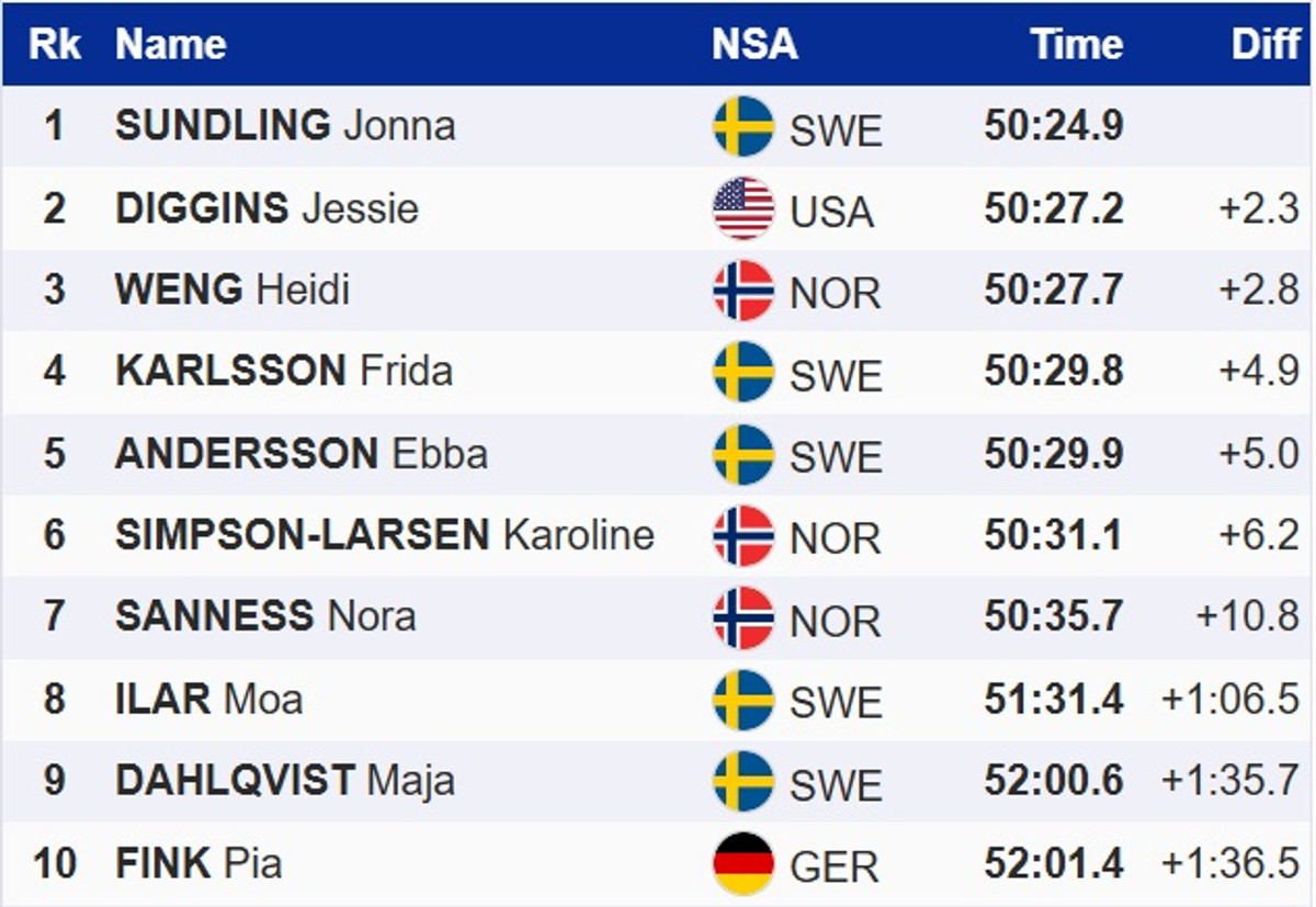 Шведская лыжница Йонна Сундлинг выиграла масстарт на 20 км свободным стилем на этапе Кубка мира в финской Руке. В финишном спринте она на 2,3 секунды опередила американку Джессику Диггинс. Топ-3 замкнула норвежка Хейди Венг.
