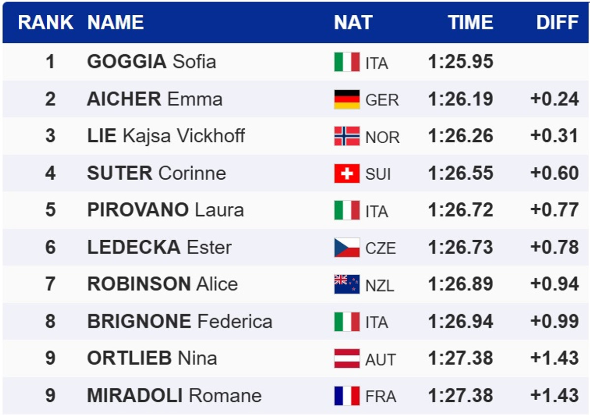 В Сольдеу Годжа на 0,24 секунды опередила вчерашнего победителя, немку Эмму Айхер. Топ-3 с отставанием в 0,31 секунды замкнула норвежка Кайса Викхофф Ли, для которой это лишь второй подиум в текущем сезоне.