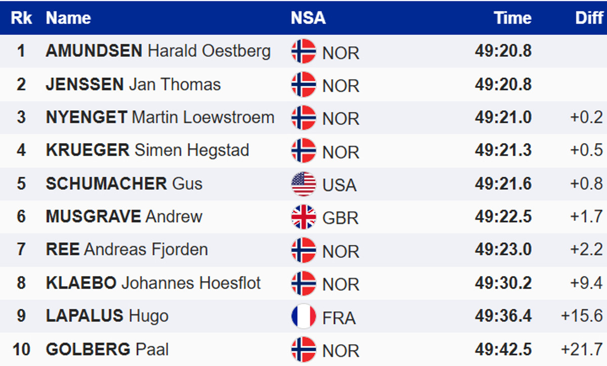В финишном спринте Харальд опередил партнера по команде Яна Томаса Йенссена. Топ-3 замкнул еще один норвежец, Мартин Левстрем Ньенгет, в пятницу выигравший разделку на 10 км вольным стилем. Победитель вчерашнего спринта, Йоханнес Клэбо, финишировал лишь восьмым.