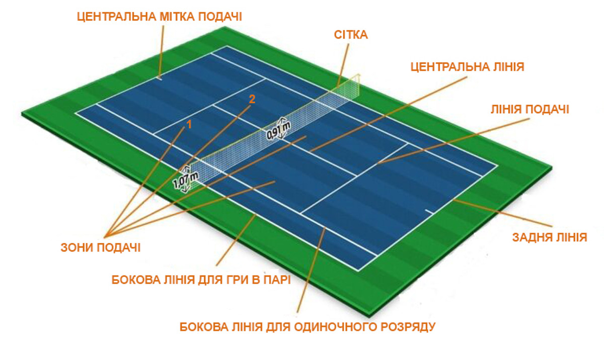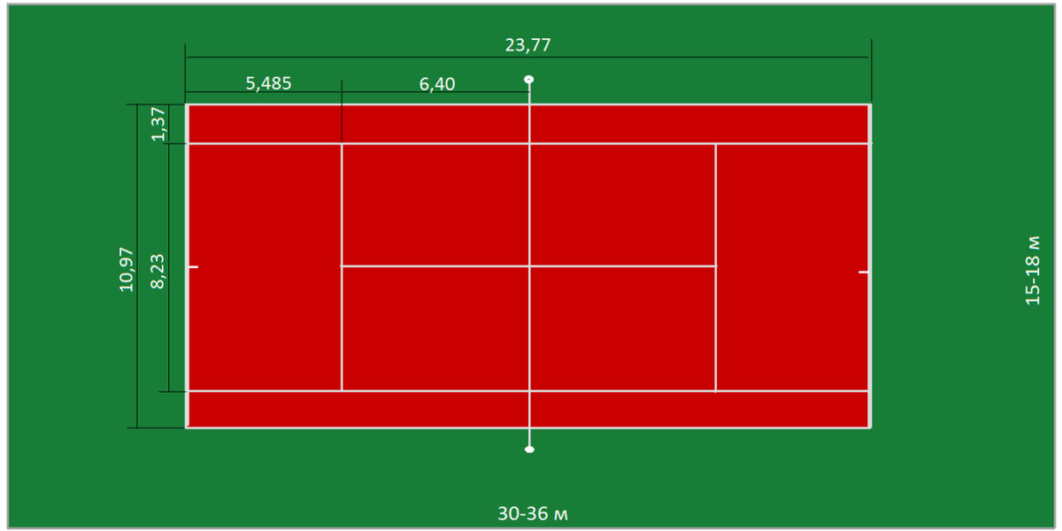 Кортом является прямоугольник длиной 23,77 м и шириной 8,23 м для одиночного матча, а также 10,97 м – для парного.