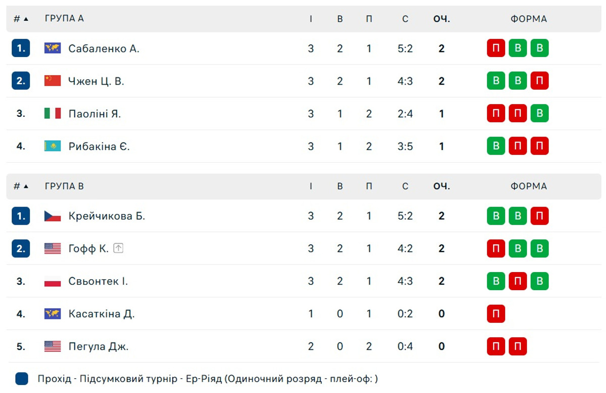 В Фиолетовой группе первой ожидаемо финишировала лидер мирового рейтинга Арина Сабаленко, компанию в плей-офф от этого квартета ей составит китаянки Чжэн Циньвэнь (7). Итальянка Жасмин Паолини (4) и представительница Казахстана Елена Рыбакина (5) выиграли по одному матчу в группе, но покидают турнир.