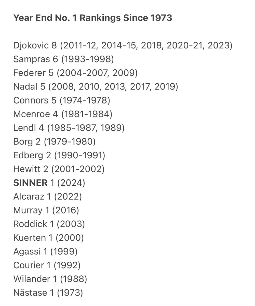 С момента введения рейтинга ATP в 1973 году Янник стал 19 теннисистом, который финишировал первым по результатам сезона. Чаще всего это удавалось Новаку Джоковичу (8 раз), Питу Сампрасу (6), а также Роджеру Федереру, Рафаэлю Надалю и Джимми Коннорсу (по 5 раз).