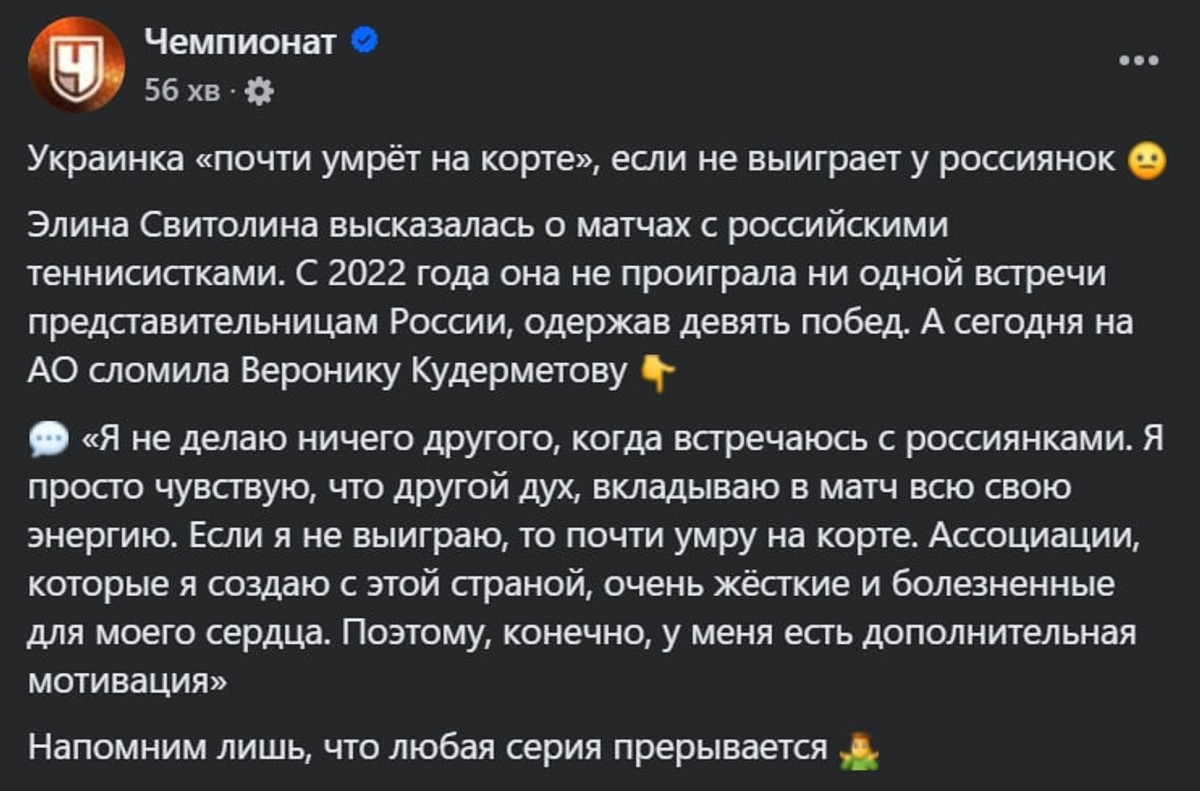Одно из российских спортивных изданий отреагировало на слова украинки, опубликовав в социальных сетях целый пост на эту тему.