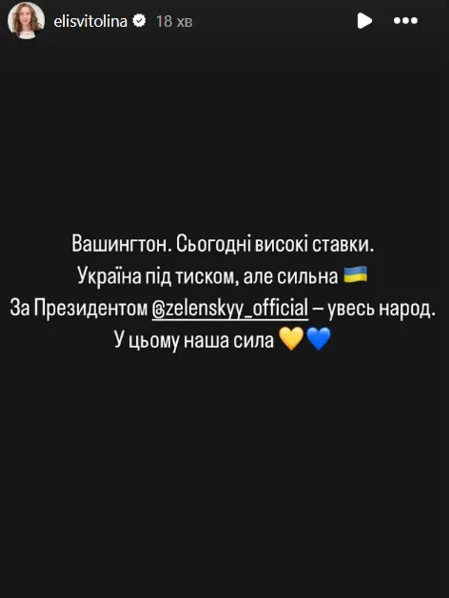 "Вашингтон. Сегодня высокие ставки. Украина под давлением, но сильная. За президентом Владимиром Зеленским – весь народ. В этом наша сила", – написала Свитолина.