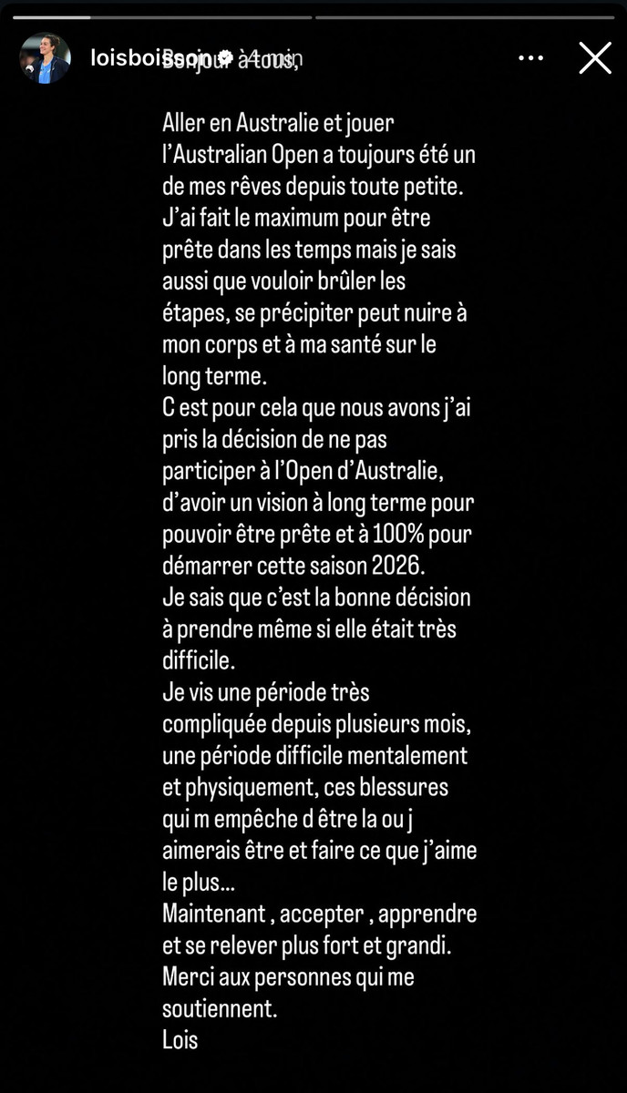 35 ракетка мира француженка Лоис Буассон сообщила, что не выступит на первом турнире Grand Slam текущего сезона, Australian Open.