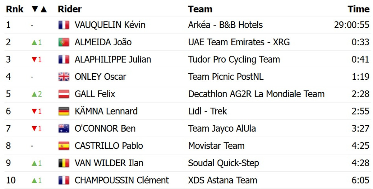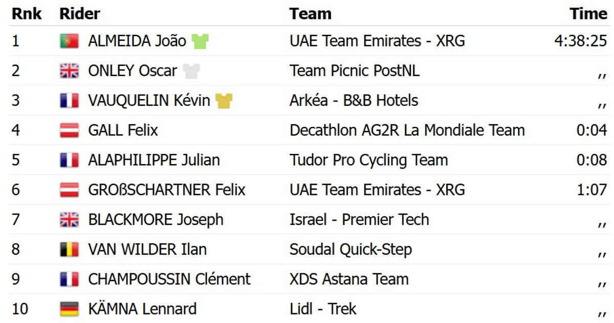 Алмейда в финишном спринте опередил британца Оскара Онли из команды Picnic PostNL и француза Кевина Воклена из ArkeaB&B Hotels. Четвертым с отставанием в 4 секунды финишировал австриец Феликс Галль из Decathlon Ag2r.