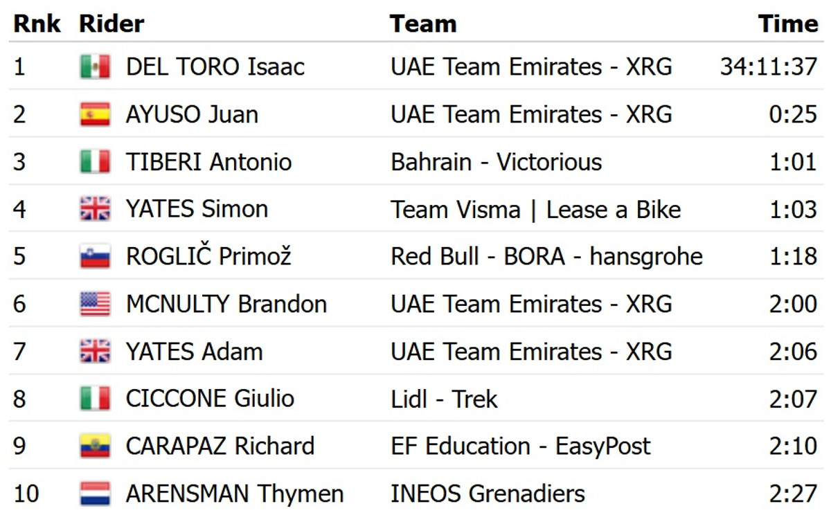 Лидерство в общем зачете сохранил мексиканец Исаак Дель Торо из команды UAE Emirates. Словенец Примож Роглич из Red Bull Bora поднялся на пять позиций и сейчас идет на 5 месте в генеральной классификации.