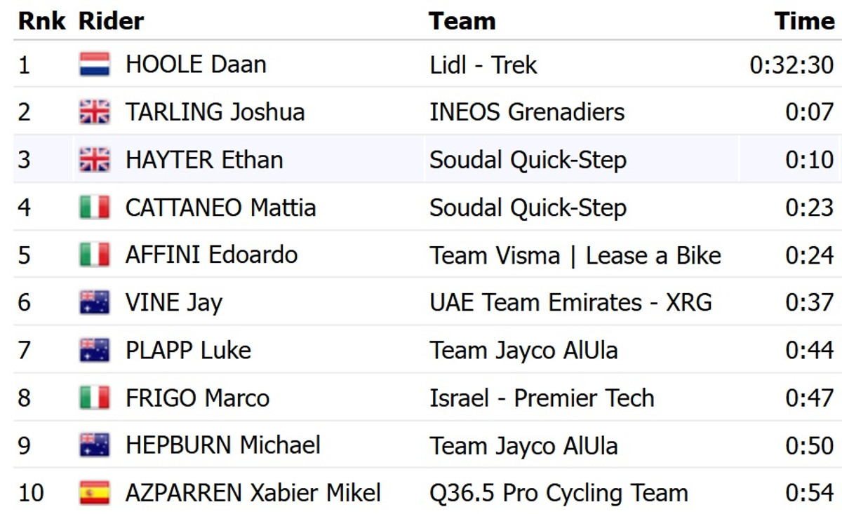 Хооле, в отличие от большинства прямых соперников, посчастливилось проехать еще до ухудшения погодных условий, что и принесло ему первую в карьере победу на Гран турах. 26-летний голландец на 7 секунды опередил победителя первой разделки, британца Джошуа Тарлинга из Ineos Grenadiers.
