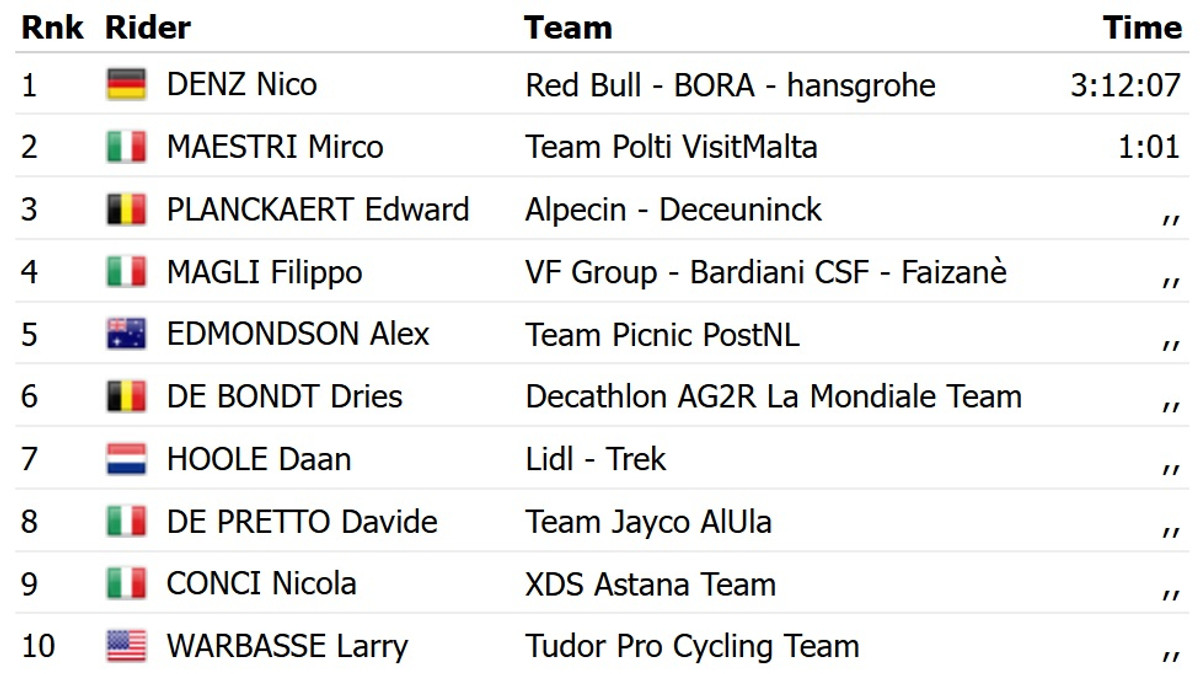 Денц благодаря поздней атаке с отрыва более чем на минуту опередил итальянца Мирко Маэстри из команды Polti и бельгийца Эдварда Планкарта из Alpecin Deceuninck.