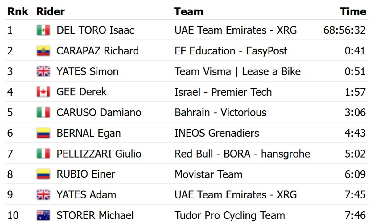 Пелотон финишировал с отставанием в 13 минут и 51 секунду. Никаких перестановок в верхушке общего зачета не произошло - розовую майку лидера сохранил победитель 17 этапа, мексиканец Исаак Дель Торо из UAE Emirates. Его партнер по команде Хуан Аюсо сегодня сошел с гонки.