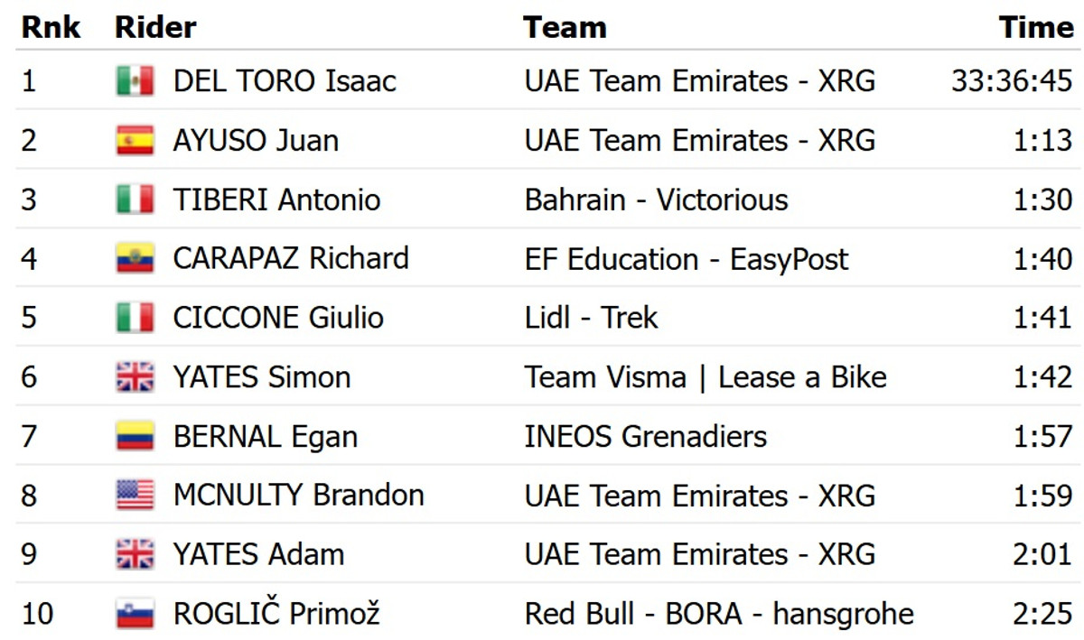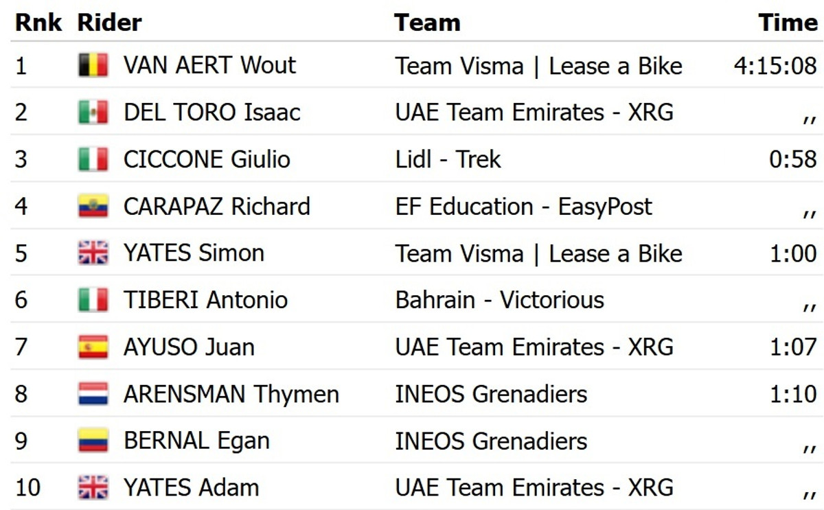 Ван Арт в парном финишном спринте опередил мексиканца Исаака Дель Торо из команды UAE Emirates. Тот благодаря второму месту перехватил розовую майку лидера общего зачета. Дель Торо стал первым в истории мексиканцем, который возглавил общий зачет Гран тура.
