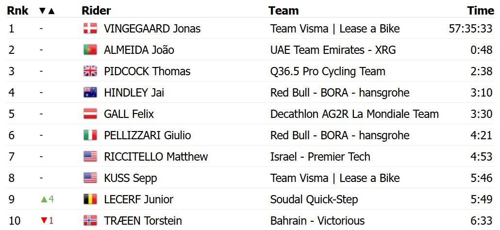 Пелотон финишировал с отставанием в 13 минут и 31 секунду. Красную майку лидера общего зачета сохранил датчанин Йонас Вингегор из команды Visma Lease a Bike. Бельгиец Жуниор Лесерф из Soudal Quick Step благодаря участию в отрыве дня поднялся на 9 место в генеральной классификации.