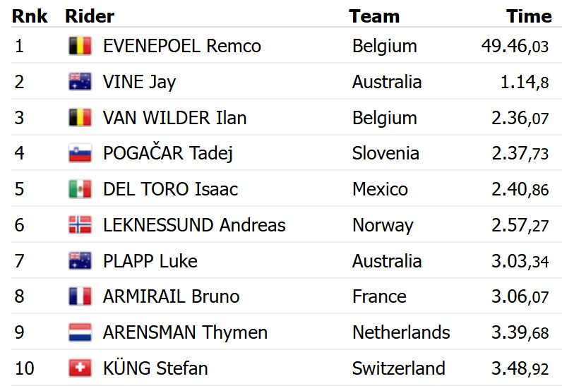 Тадей Погачар в борьбе за бронзу проиграл Ван Вилдеру менее двух секунд. Поражение звездного словенца оказалось особенно болезненным и унизительным, так как за 2 км до финиша его прошел Эвенепул, стартовавший на 2 минуты и 30 секунд позже.