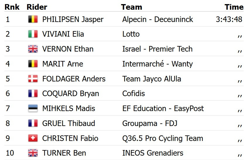 В массовом финишном спринте из пелотона Филипсен опередил итальянского ветерана Элию Вивиани из Lotto и британца Итана Вернона из Israel Premier Tech. Для Филипсена это вторая победа на текущей Вуэльте – ранее он выиграл первый этап.
