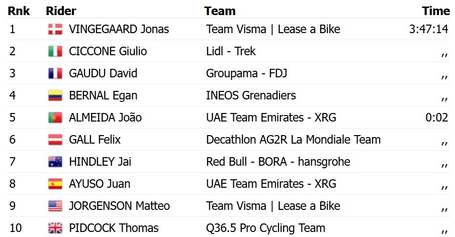 В финишном спринте из пелотона Вингегор опередил итальянца Джулио Чикконе из команды Lidl Trek и француза Давида Годю из Groupama FDJ. Эта победа позволила Вингегору перехватить красную майку лидера общего зачета. Отметим, что датчанин одержал победу даже несмотря на падение за 25 км до финиша.