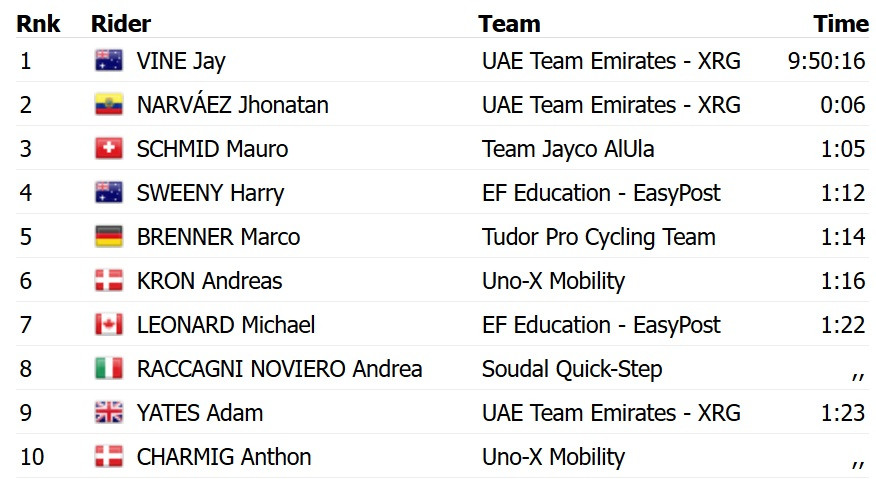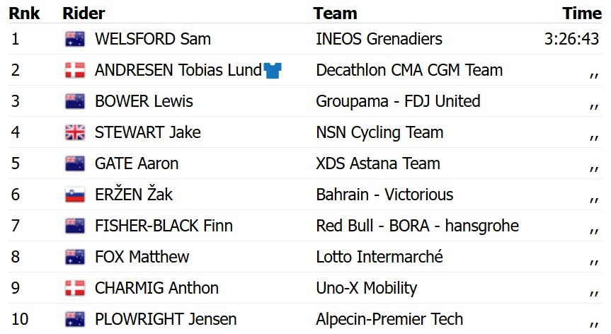 Уэлсфорд в финишном спринте опередил победителя первого этапа, датчанина Тобиаса Лунда Андресена, и новозеландца Льюиса Боуэра из Groupama FDJ. Лидерство в общем зачете сохранил австралиец Джей Вайн из UAE Emirates.