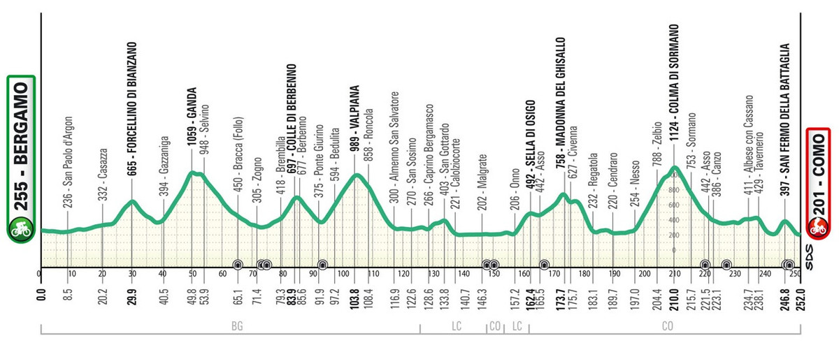 На 252 км дистанции гонщикам придется преодолеть такие перевалы как Форчелло-ди-Брианцано (6,3 км, средний уклон – 5,1%), Пассо ди Ганда (9,2 км, 7,3%), Колле ди Бербено (4,5 км, 6,2%), Вальпьяна (10,4 км, 6,1%), Селла ди Озиго (5 км, 5,7%), Мадонна дель Гизалло ( 6,3 км, 4,1%), Кольма ди Сормано (12,9 км, 6,4%) и Сан Фермо делла Батталья (2,7 км, 7,2%). Вершина последнего подъема расположена всего в 5,3 км от финиша, после чего гонщиков ждет довольно опасный и сложный технически спуск в Комо.